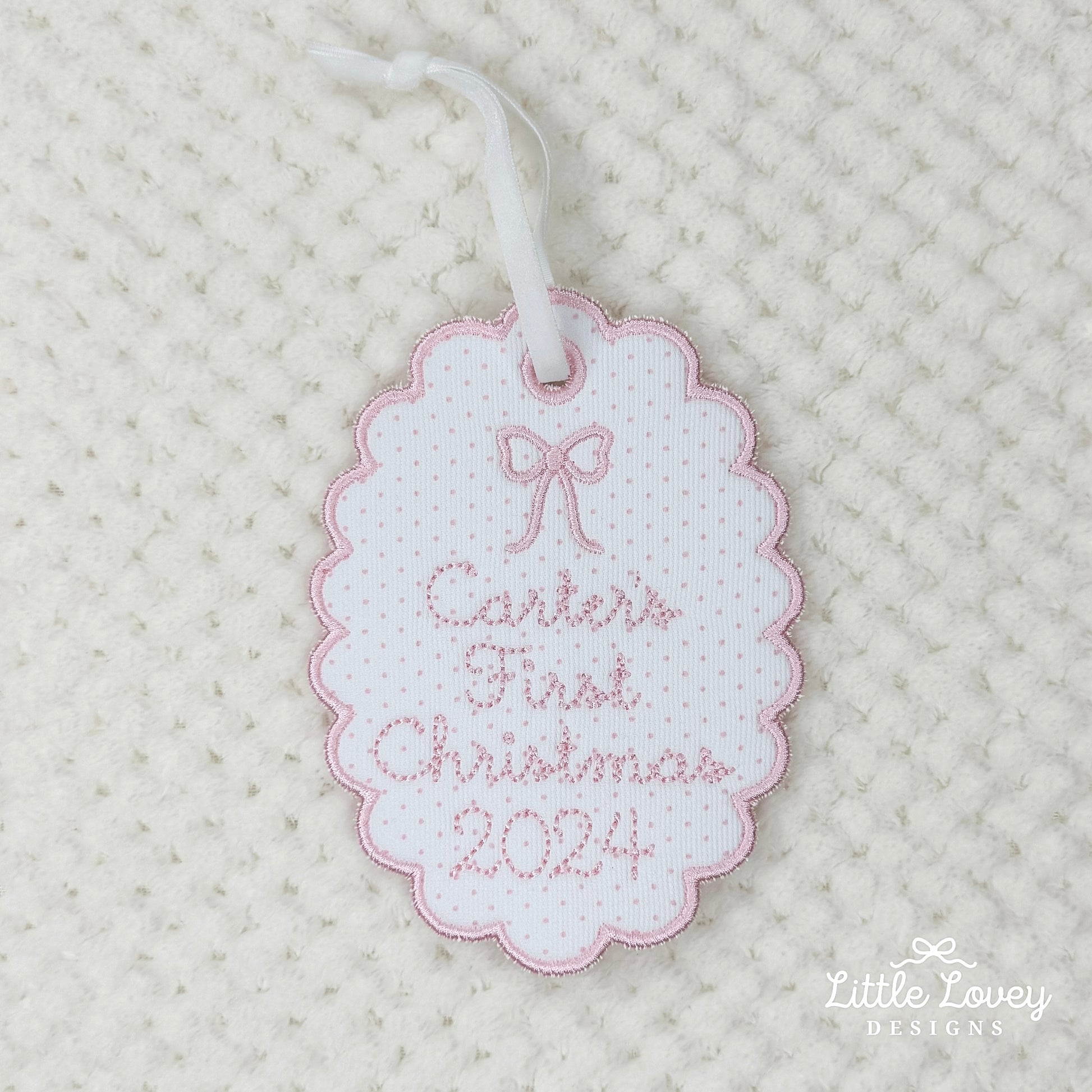 - This listing is for (1) embroidered baby girl first Christmas ornament. We have the small motif as a bow, but are happy to change it to something else if you would prefer.