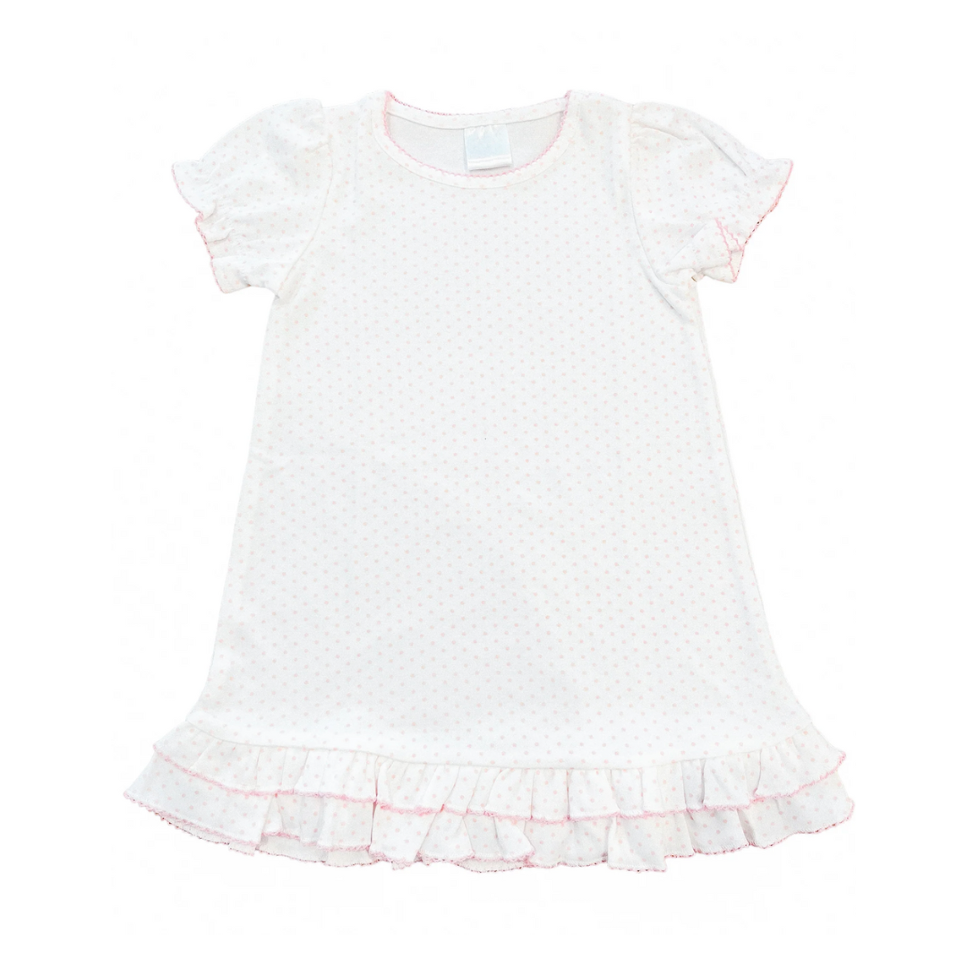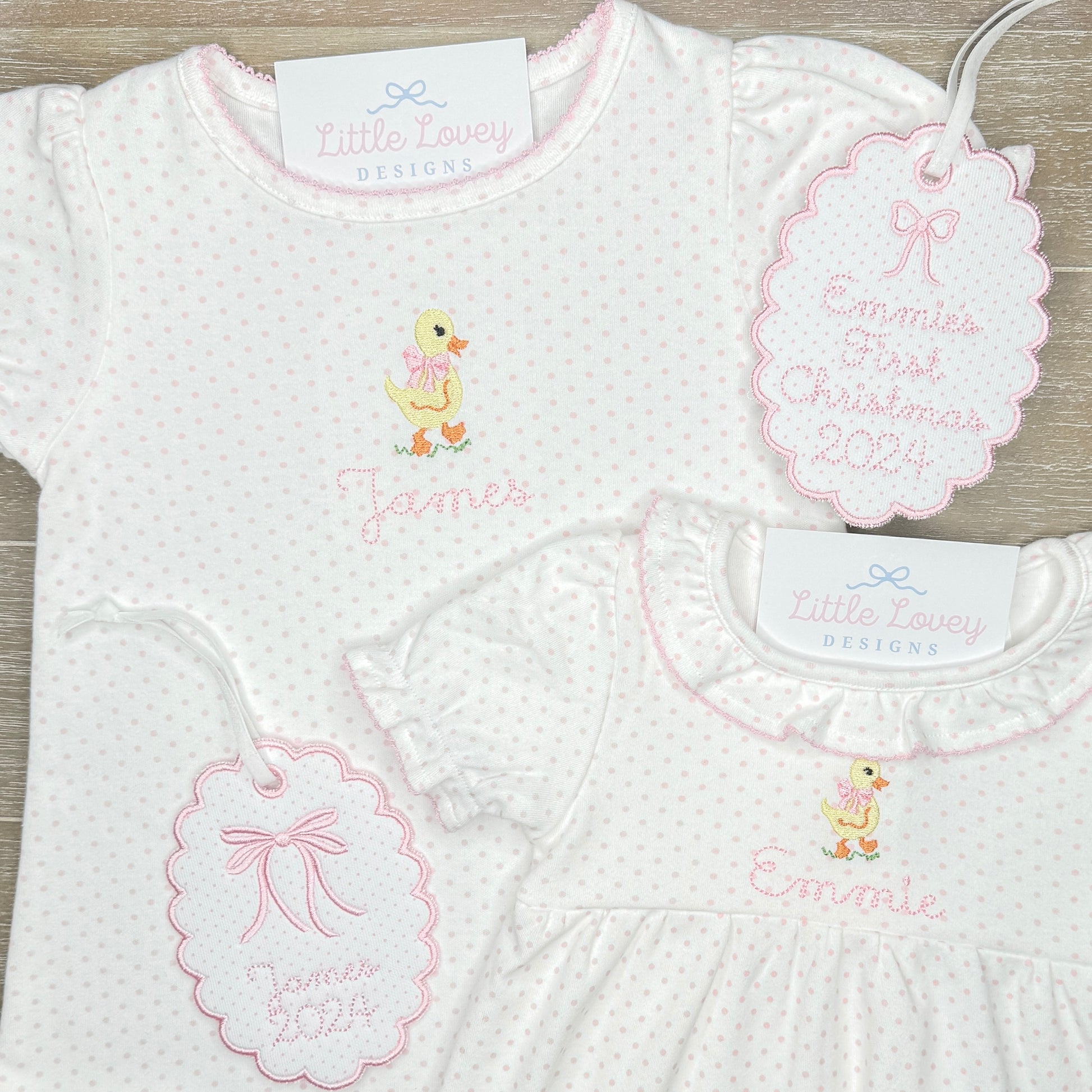 This bitty dot dress is absolutely precious and perfect for warmer days. We love the ruffles, trim detailing, and how sweet it looks with added personalization. It pairs perfectly with our bitty dot bubble if you are looking for a cute sibling match.