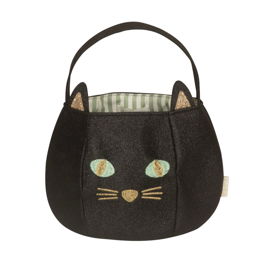 This black cat bucket bag is made with shimmering black glitter, embroidered emerald eyes, gold whiskers, and glittery ears! It is fully lined with grey stripy fabric and has a fabric handle. It is on the smaller side, but would be so cute for trick or treating or as purse for Halloween.
