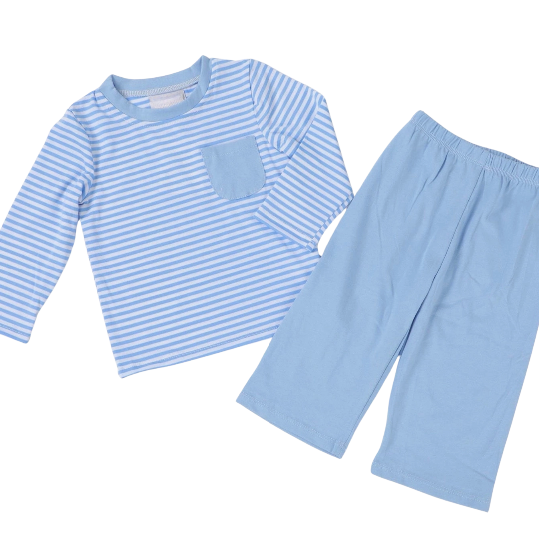 This light blue stripe pants set is precious and perfect for cooler weather. Embroidery will be on the pocket and can be customized with any design/motif you would like over a monogram. We also have this set in red.
