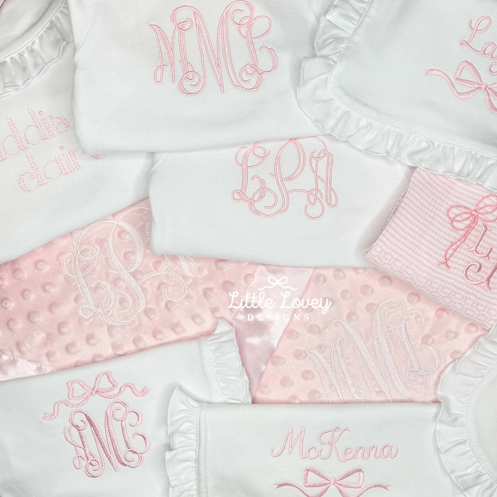 - Please note that longer names may be smaller in size in order to fit nicely on the item. Placement will be in the bottom corner diagonally unless stated otherwise. Embroidery will show through to the other side.