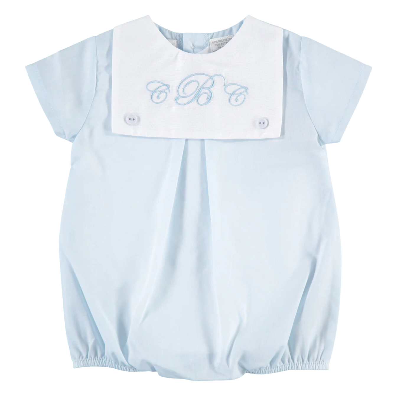 This classic blue onesie is such a traditional and timeless outfit. It features an elegant blank collar for matching custom embroidery and makes a perfect classic outfit for any spring or summer special occasion.