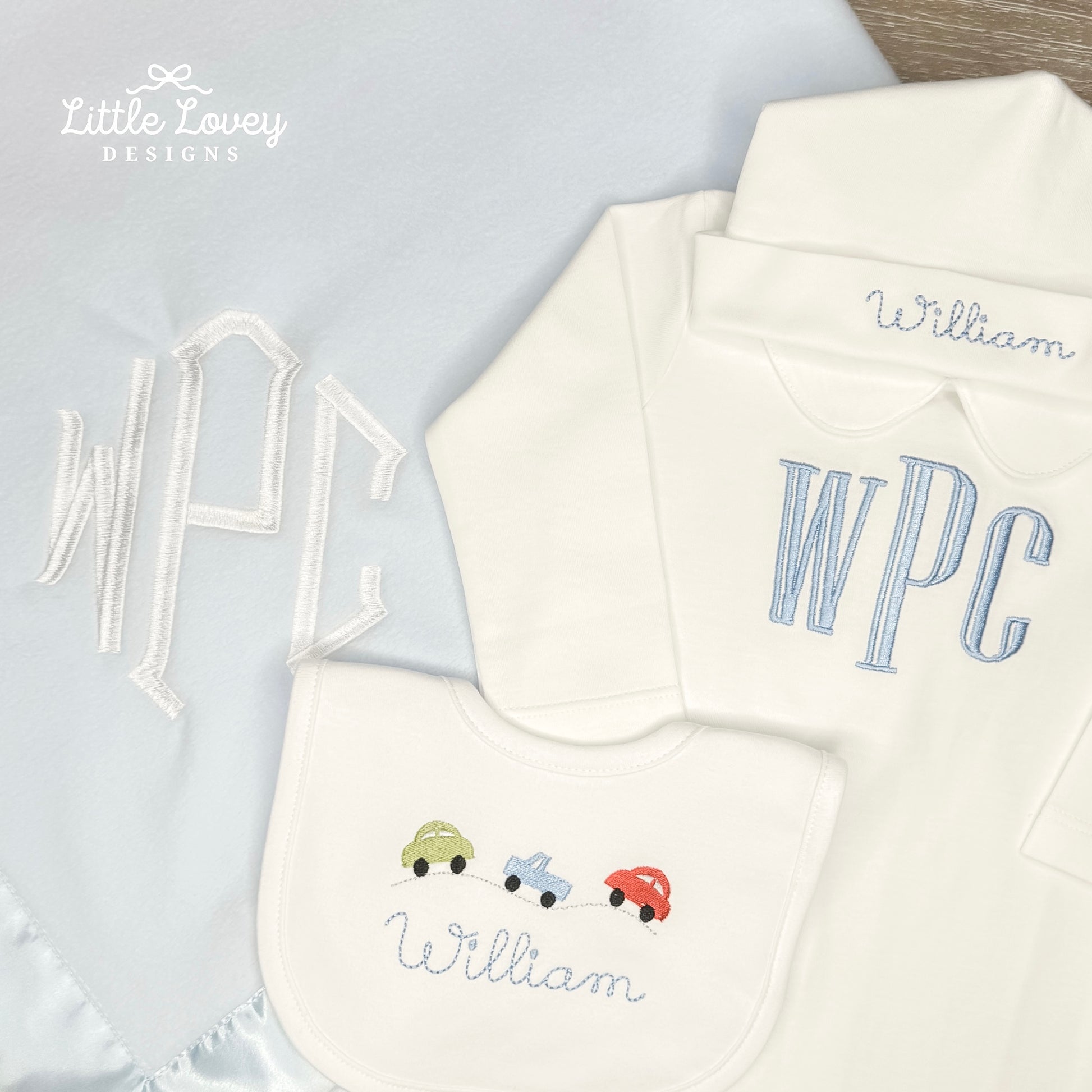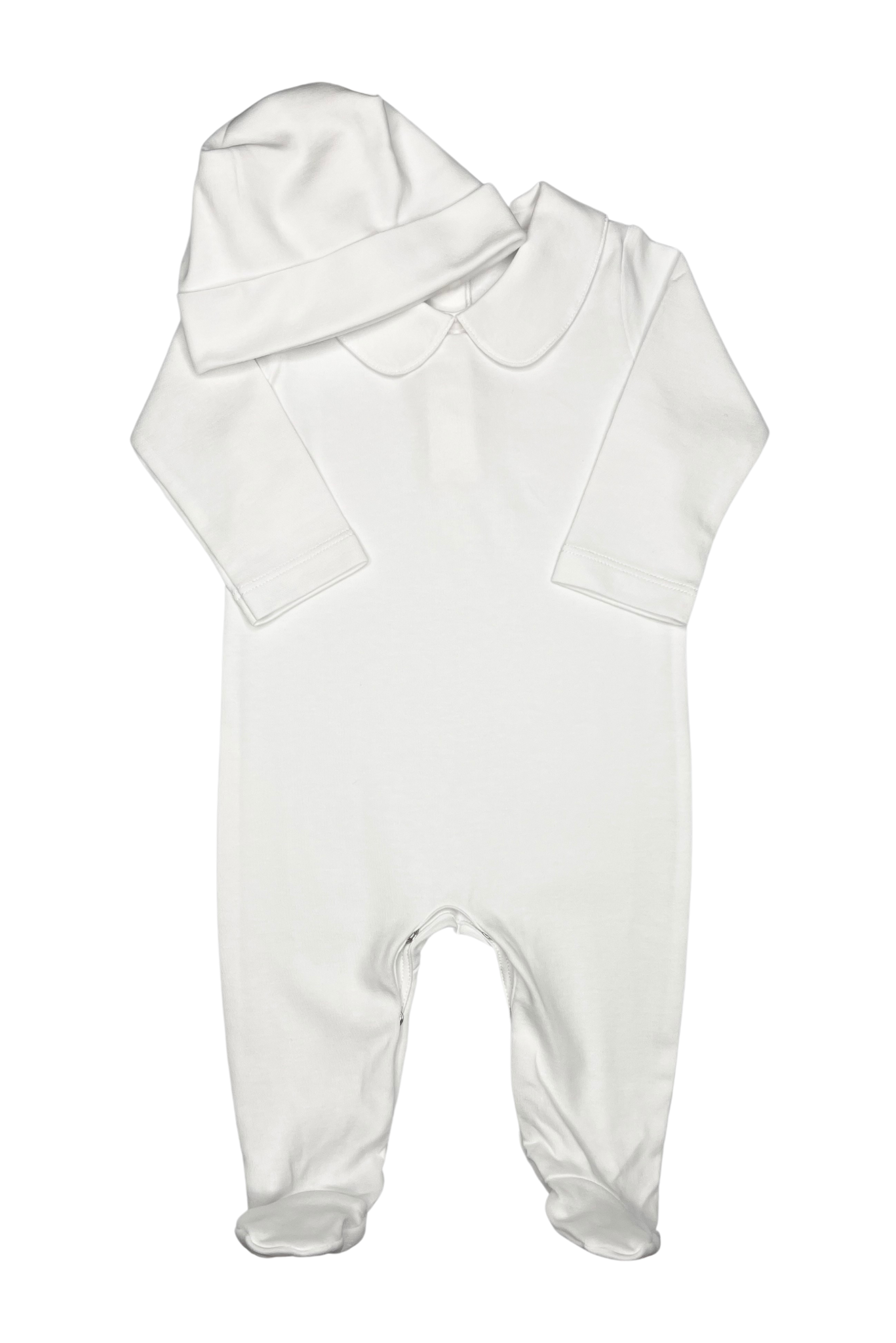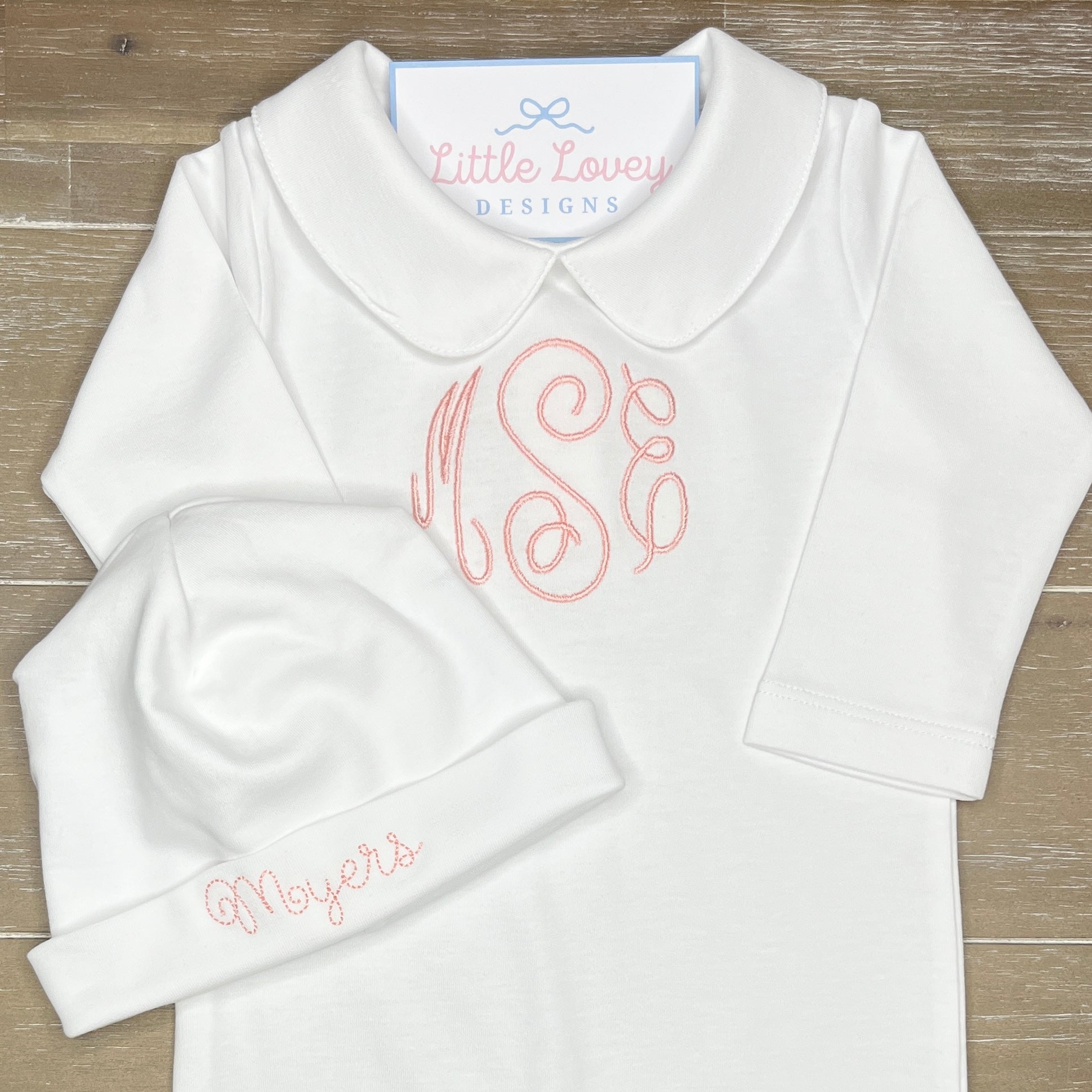 This collared footie and hat pair together to make a perfect coming home outfit for your baby girl or boy. We love how soft they are and how sweet they look with added personalization. This is an outfit you will want to save and remember forever! This outfit also makes a wonderful personalized baby shower gift.