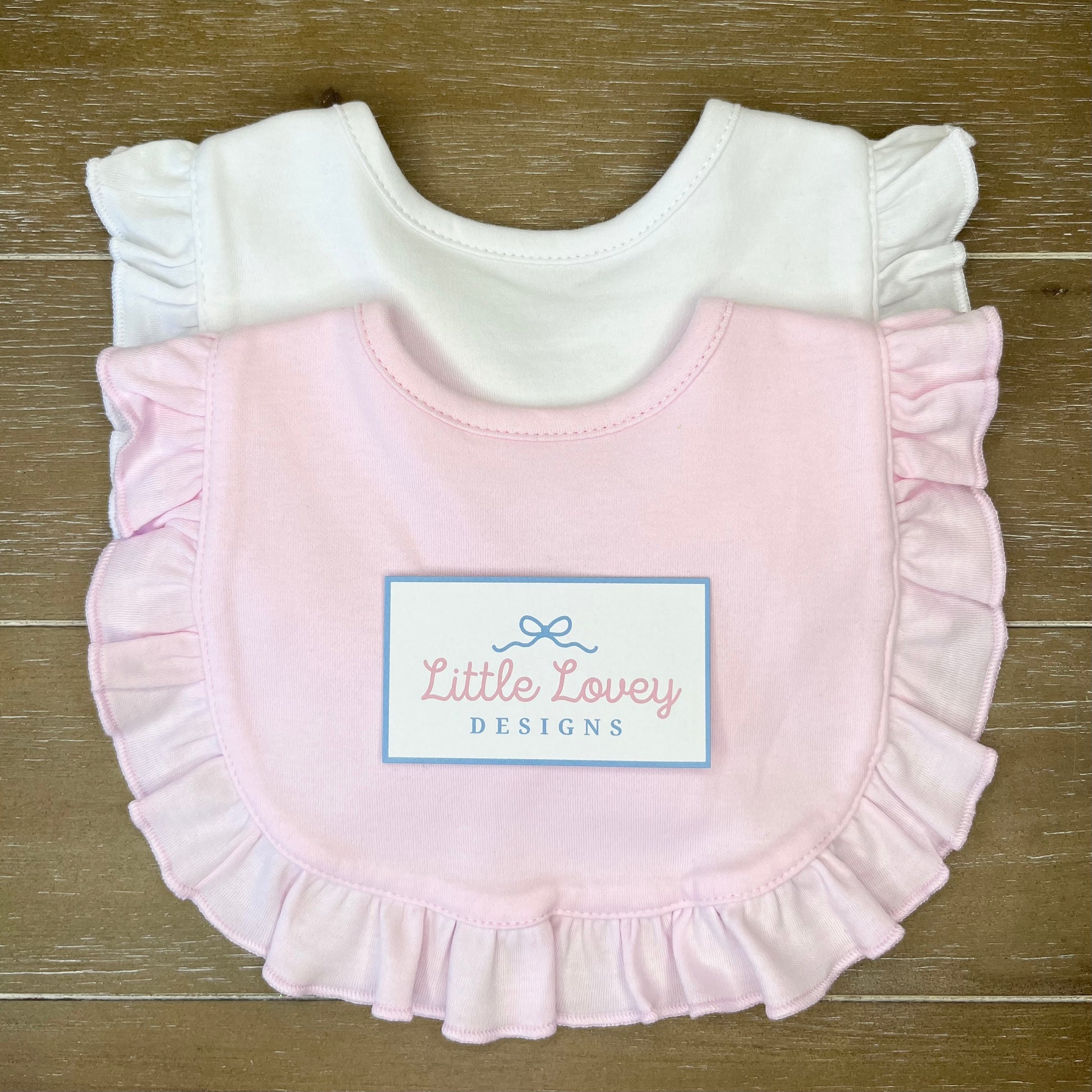 - Our ruffle bibs are one size, white or pink in color, and have a snap closure. They are made of 100% interlocking cotton.
