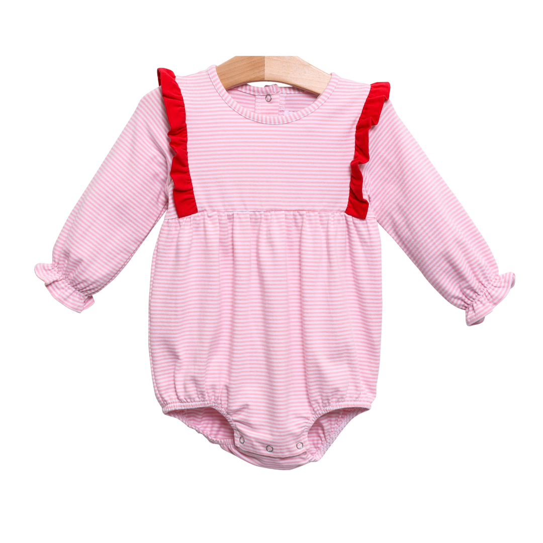 This precious bubble has long sleeves, the cutest red ruffles, and looks precious with added personalization. We think it is perfect for any day of the year, but would also be precious with a Valentine's Day or Christmas design. It pairs perfectly with our Evie dress if you are looking for a cute sibling match.