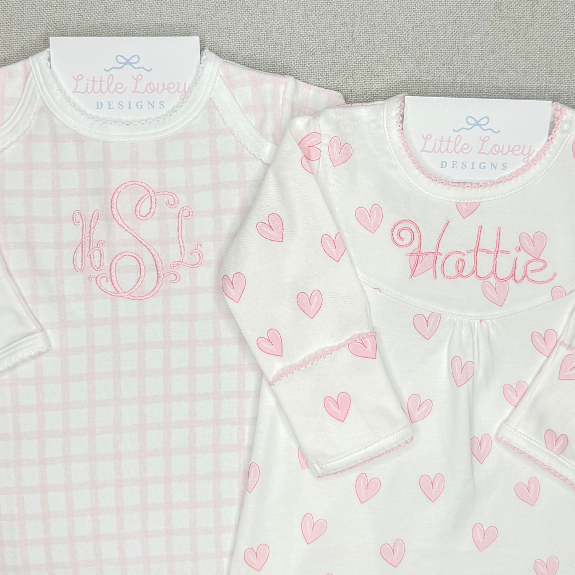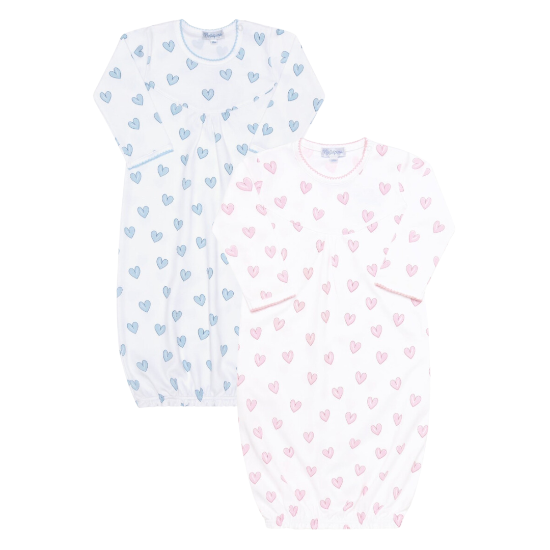 This heart print gown is so soft and comes in two different colors. We love the print and think it looks precious with added embroidery. This is an outfit you will want to save and remember forever!