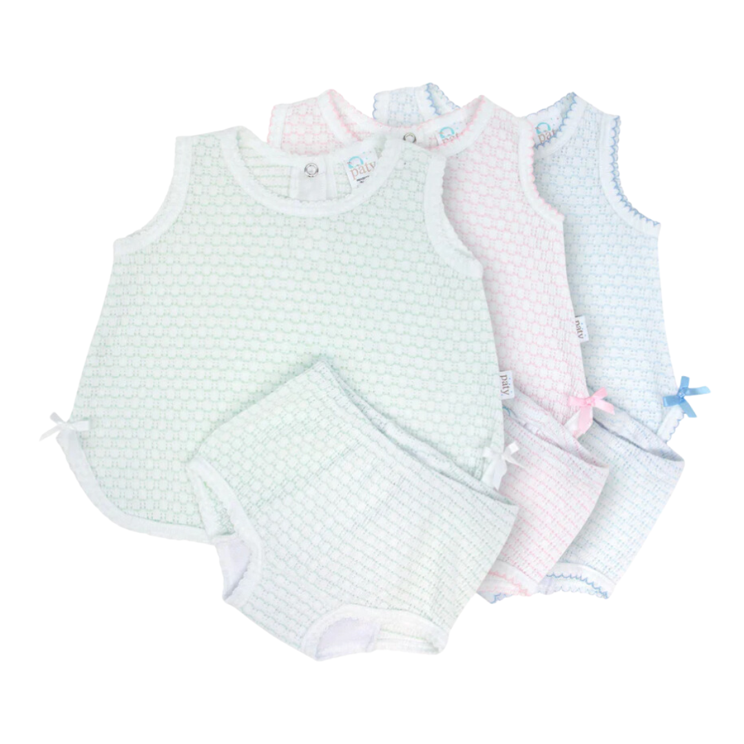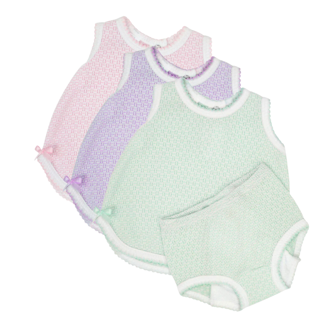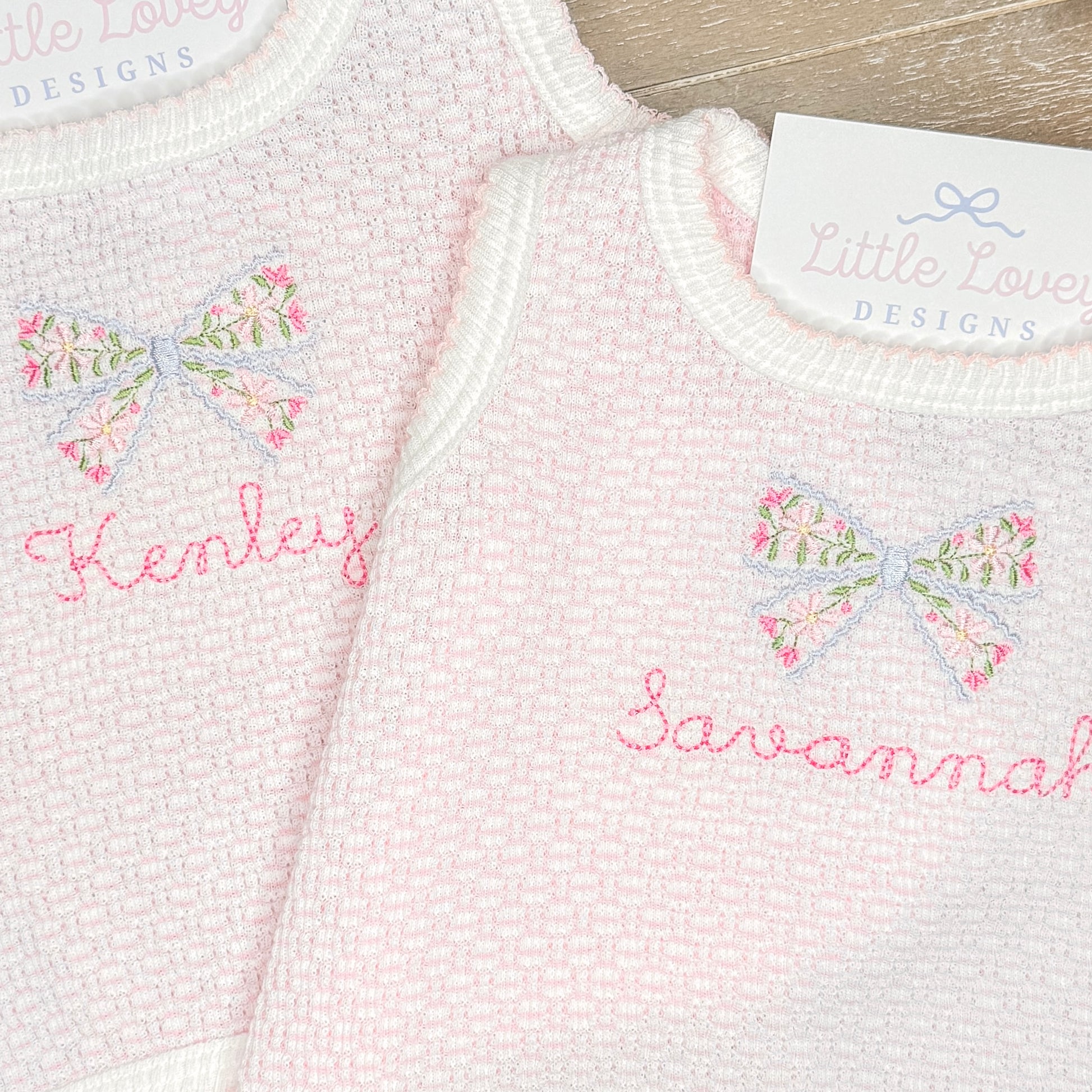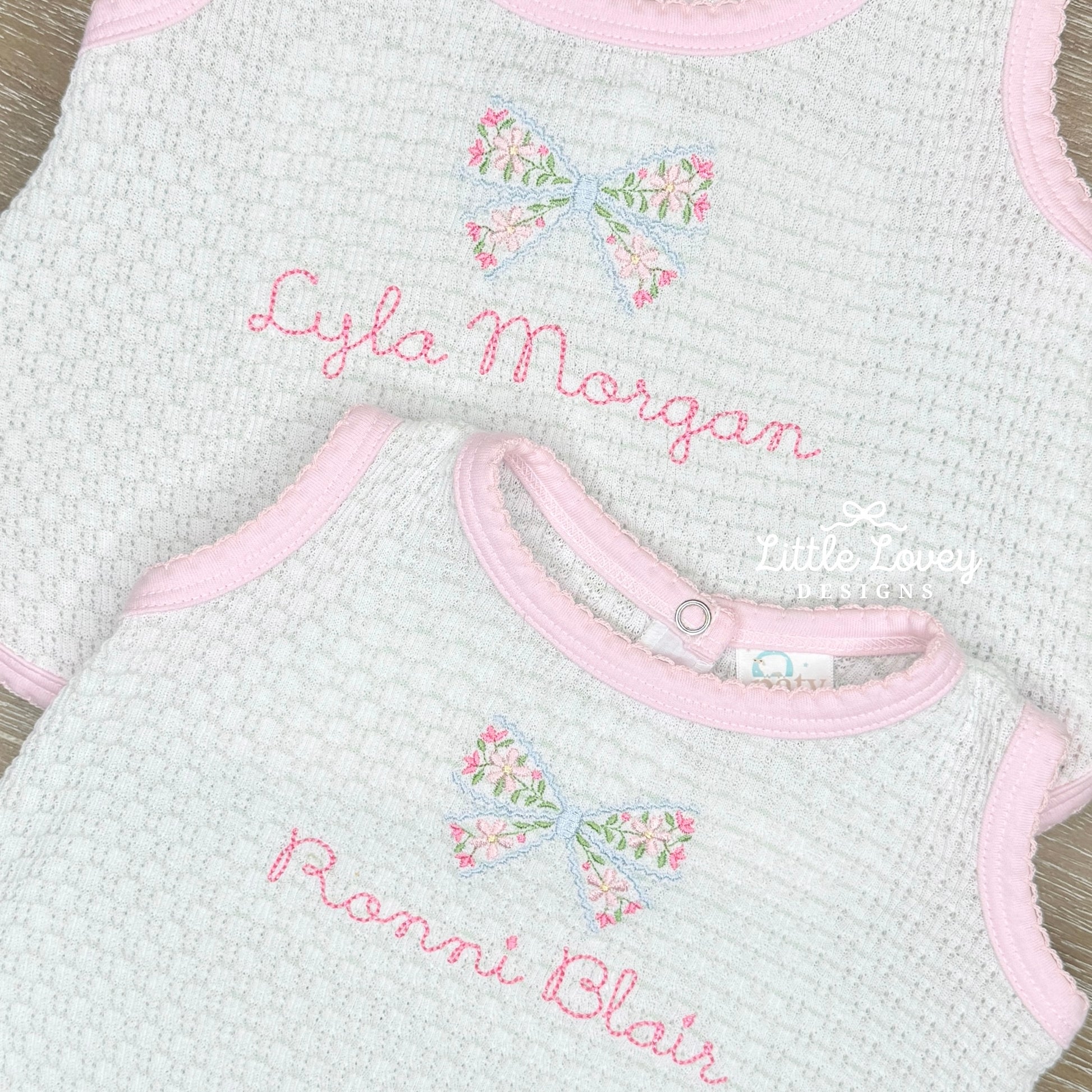 This knit sleeveless top and diaper cover set is absolutely precious and perfect for summer. We love the little bows and how sweet it looks with added personalization.