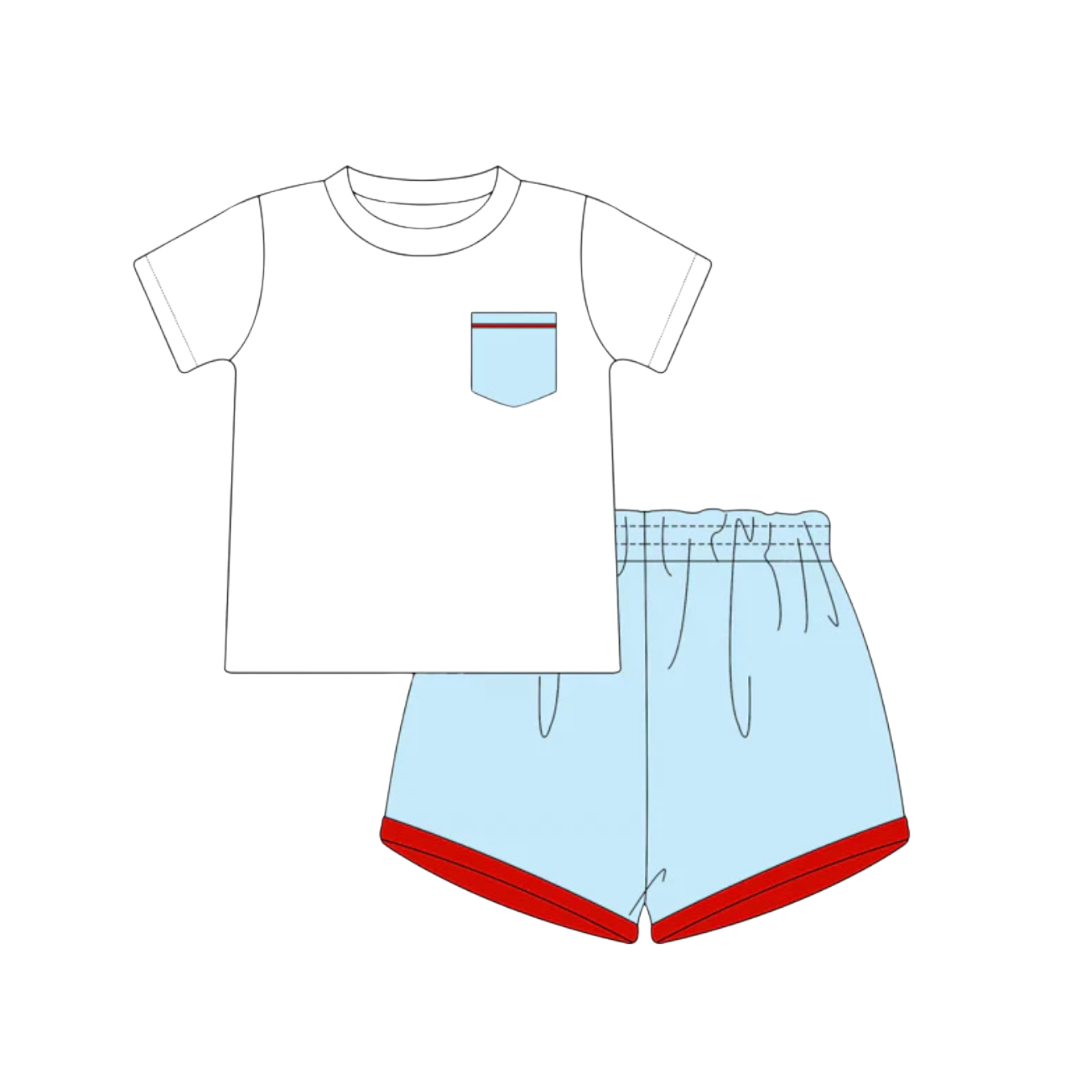 - This listing is for (1) embroidered light blue with red trim short set.