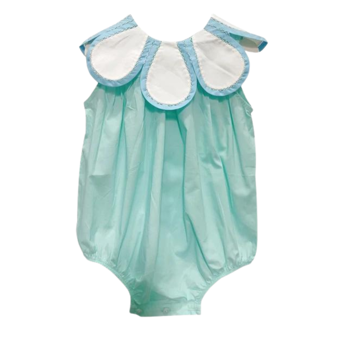 This mint tulip collar bubble is absolutely precious and perfect for spring and summer! We love all of the details and think it looks sweet as is or with added personalization. It pairs perfectly with our mint tulip collar dress for a sweet sibling match.