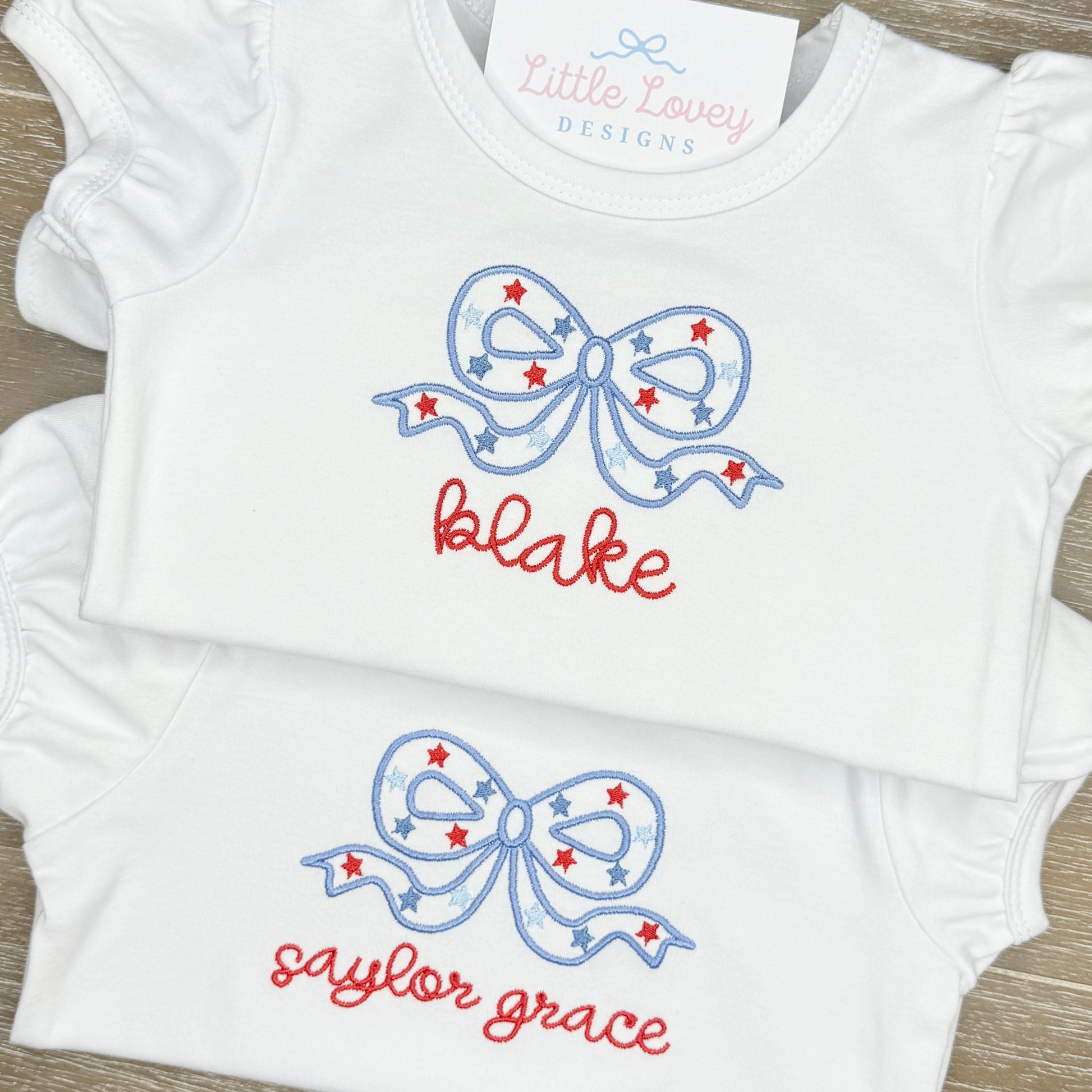This ruffle shirt is short sleeve and perfect for summer. We love the ruffle bottom, puffy cap sleeves, and detailed fit. The patriotic bow design is perfect for Memorial Day and the Fourth of July.