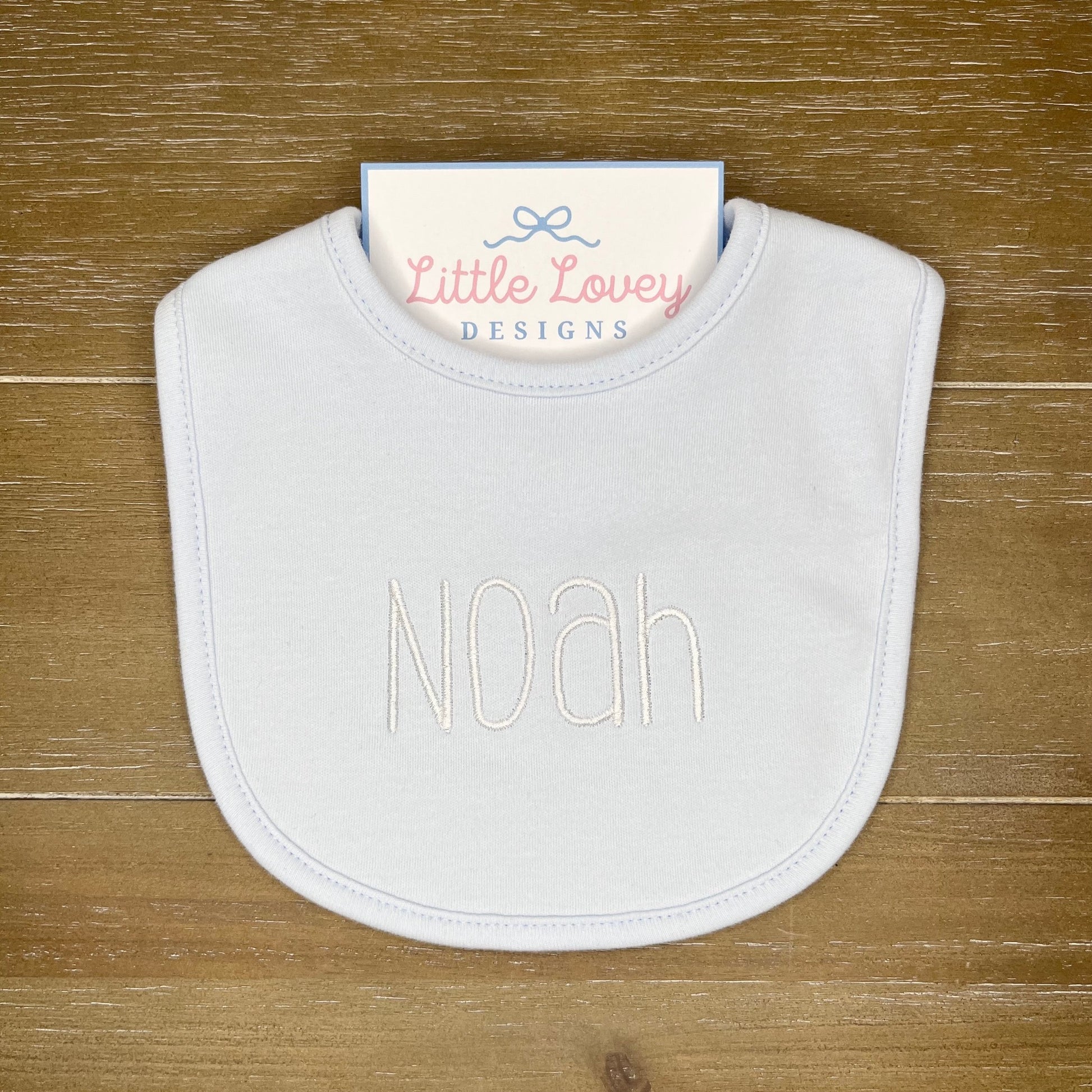 This personalized bib is the perfect accessory for your baby! It pairs perfectly with our personalized cotton burp cloth and makes for a wonderful baby shower gift.