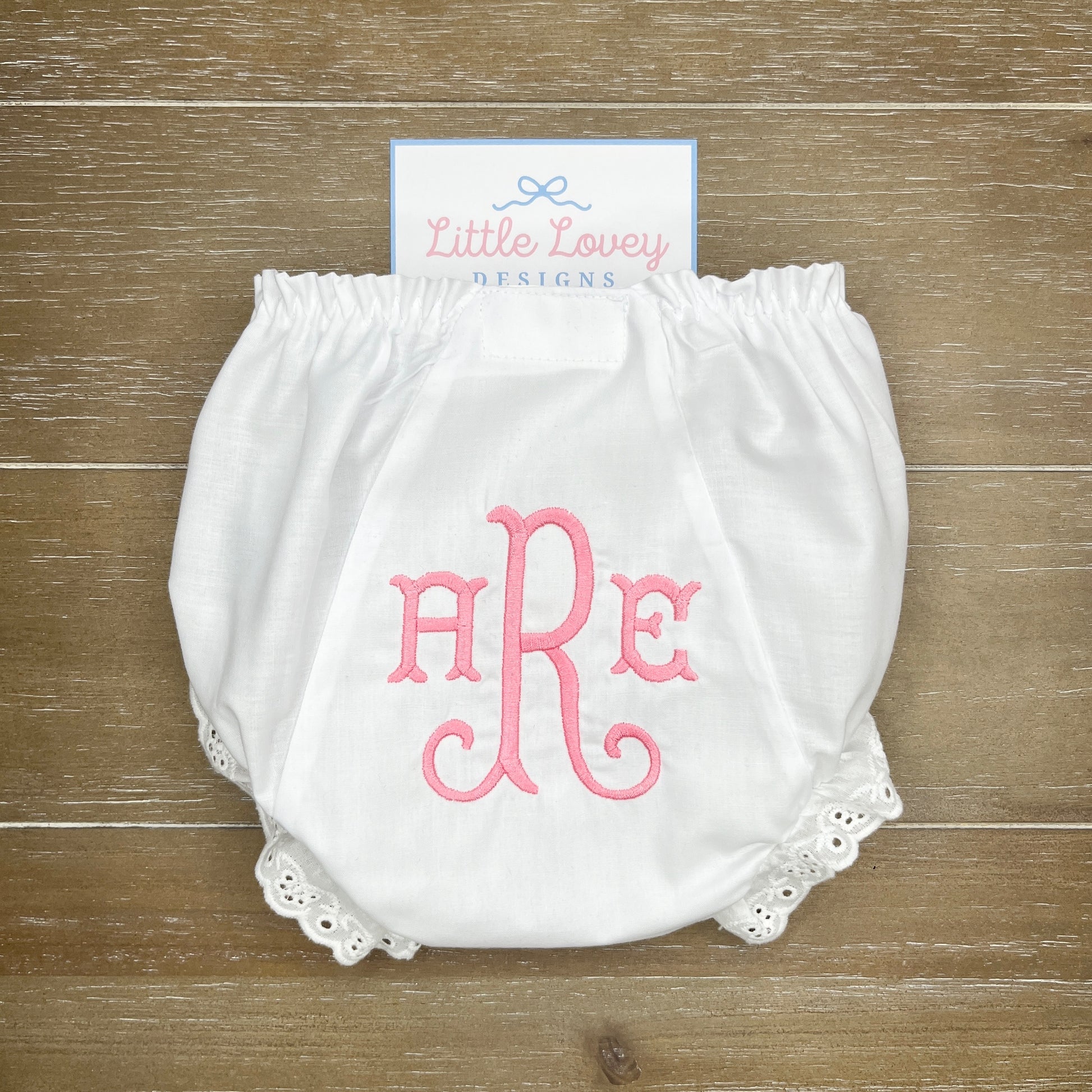 - Diaper covers are white in color, have embroidered eyelet trim at the leg openings, have a soft waist elastic, and a bias cut seat. They are made of 65% polyester and 35% cotton batiste.