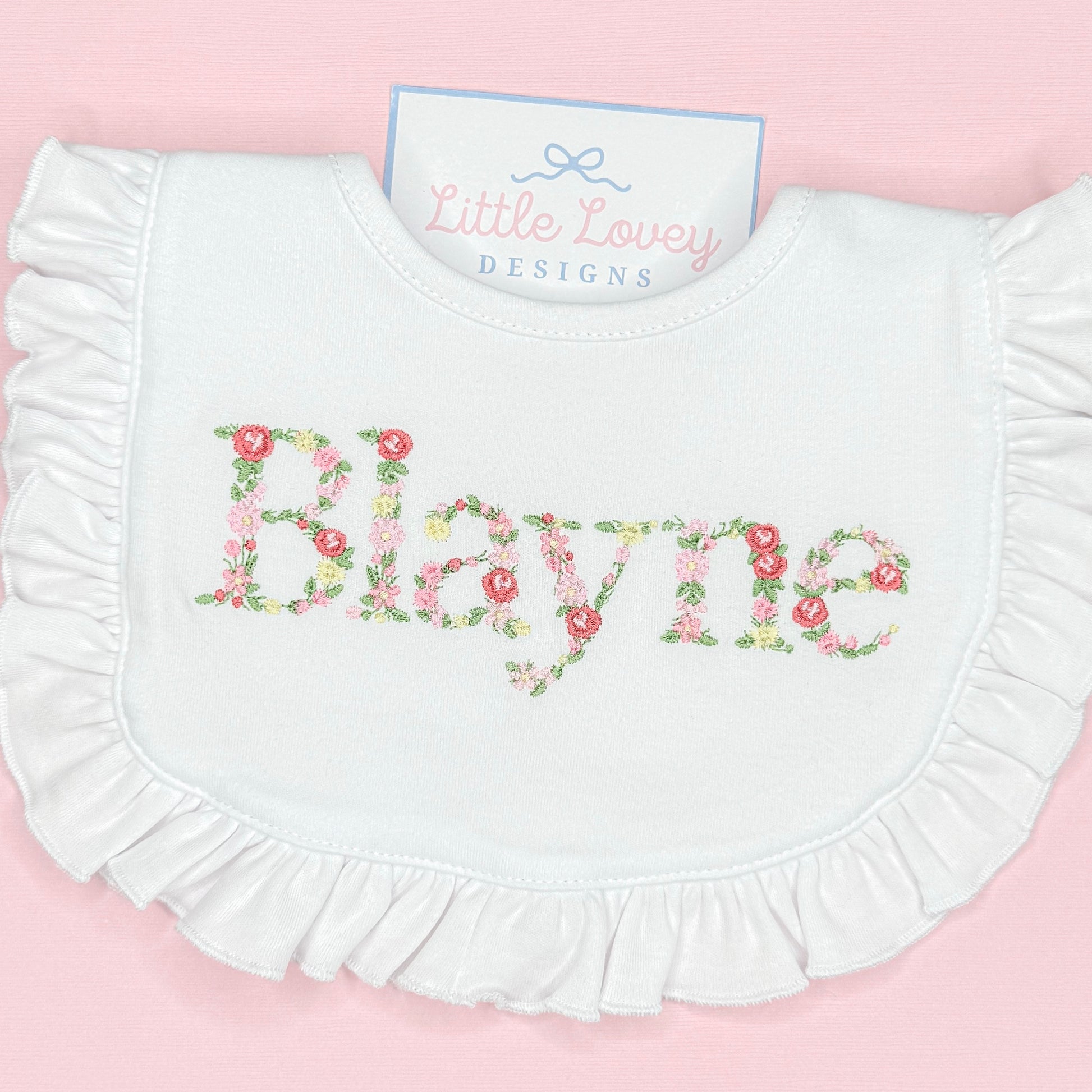This personalized floral bib is precious and perfect for any occasion. We love how girly it is and the classic look the ruffle detailing adds.