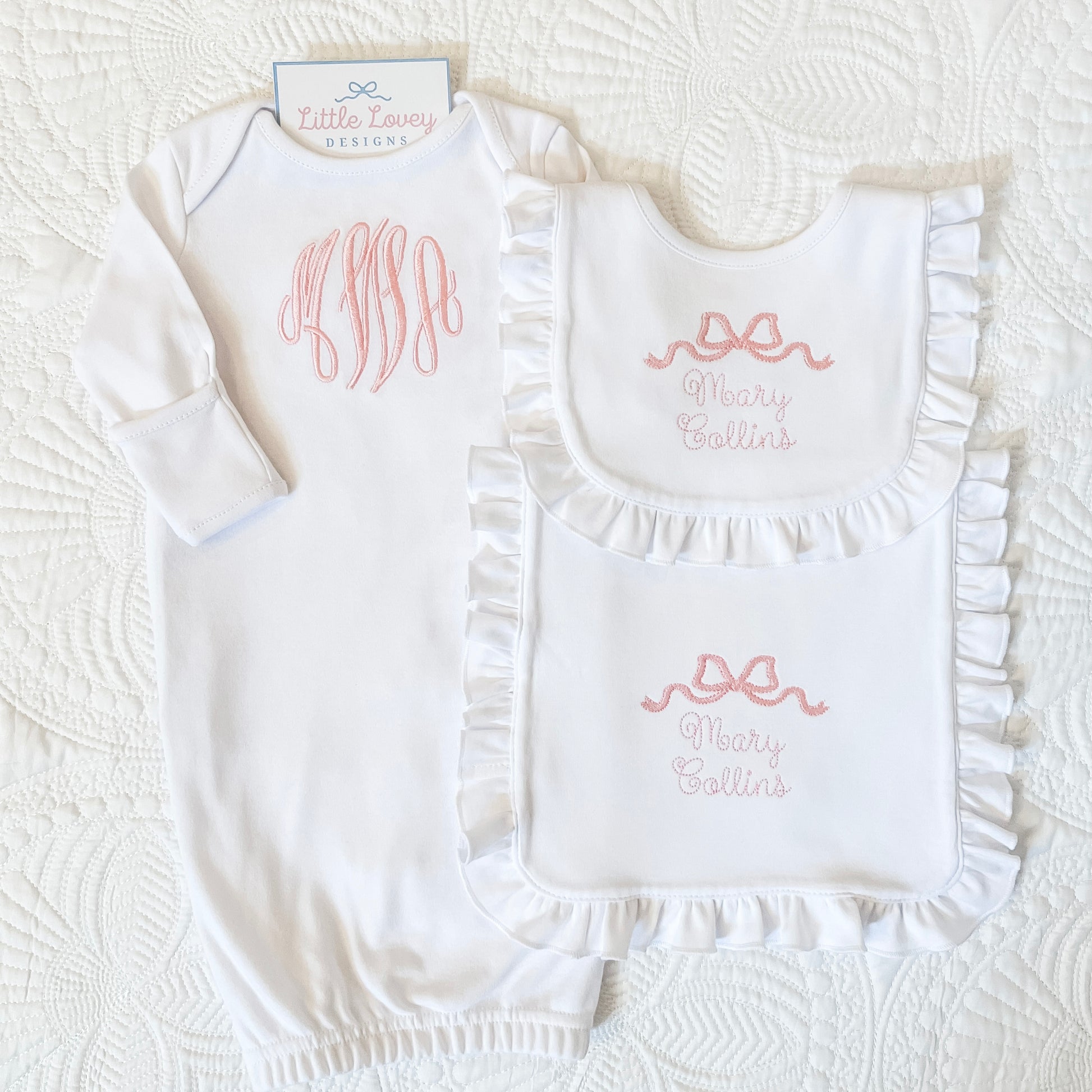 This listing is for a personalized gown, ruffle bib, and ruffle burp cloth. This set is the perfect baby shower or welcome home gift! The bib and burp cloth will have matching embroidery. We have a separate listing for a gown, bib, and burp cloth.