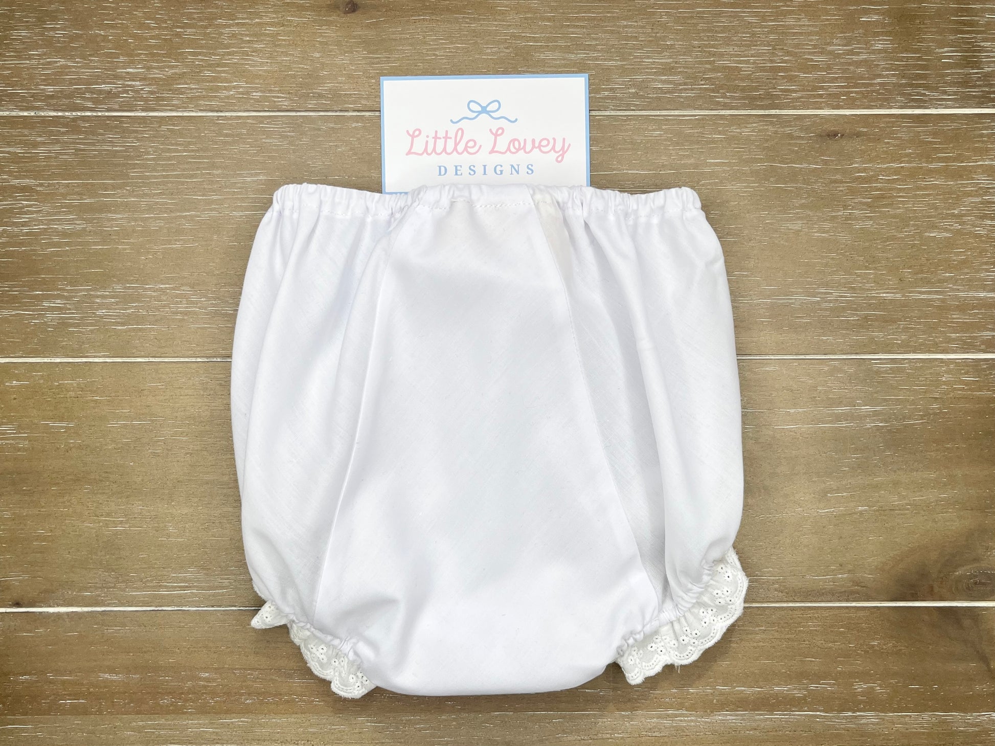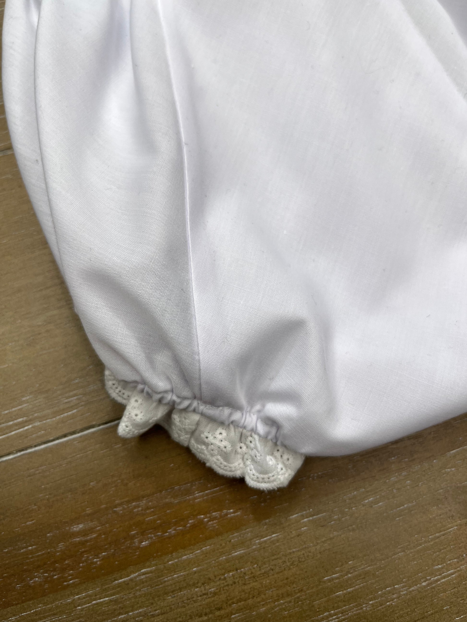These sweet eyelet baby bloomers are the perfect accessory for your little one. We love the eyelet lace ruffled legs and comfortable elastic waistband. Please note that they have a pale pale purple tint to them, which we have tried to show in the pictures.