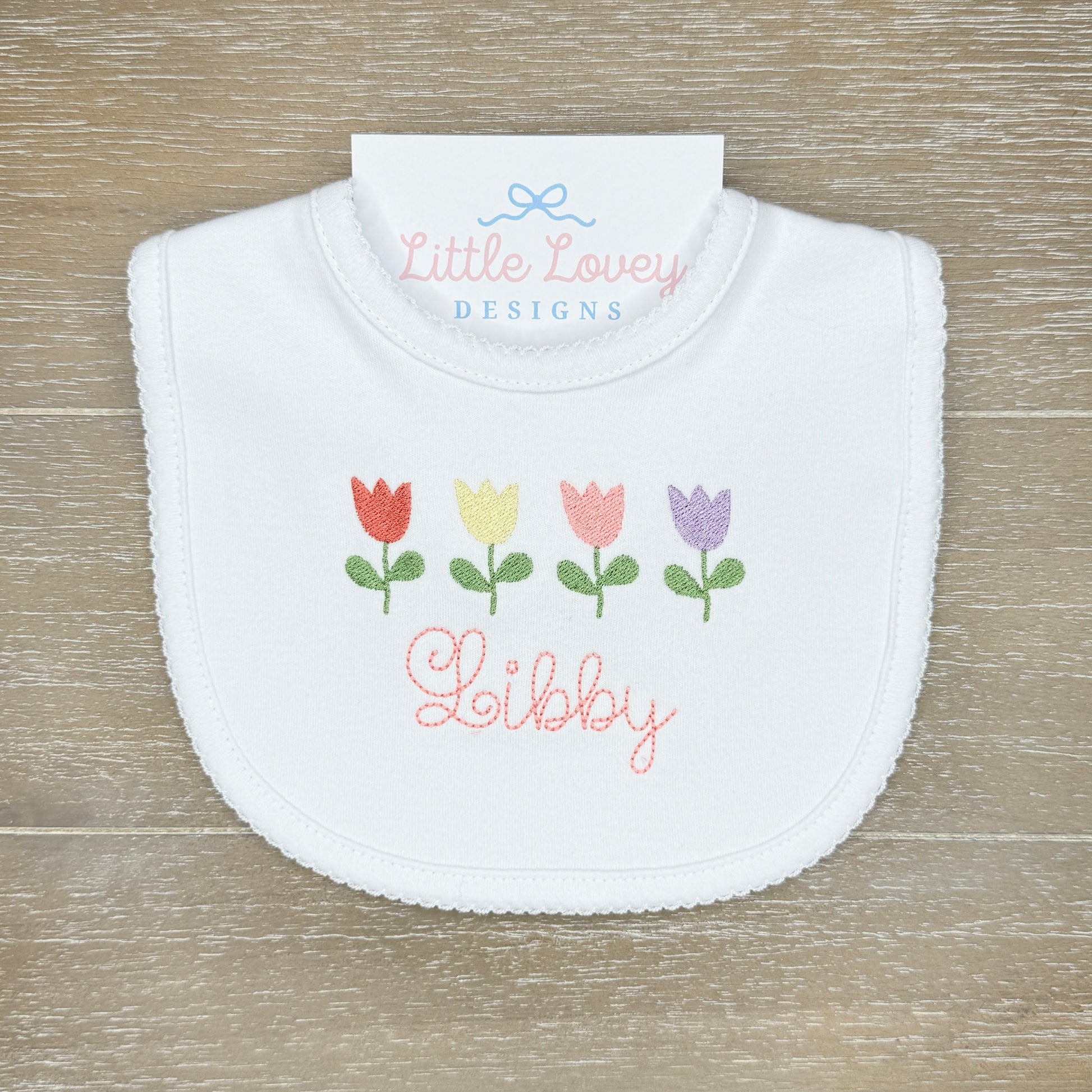 This picot trim bib is the perfect accessory for your baby! We love the trim detailing and how sweet it looks with added personalization.