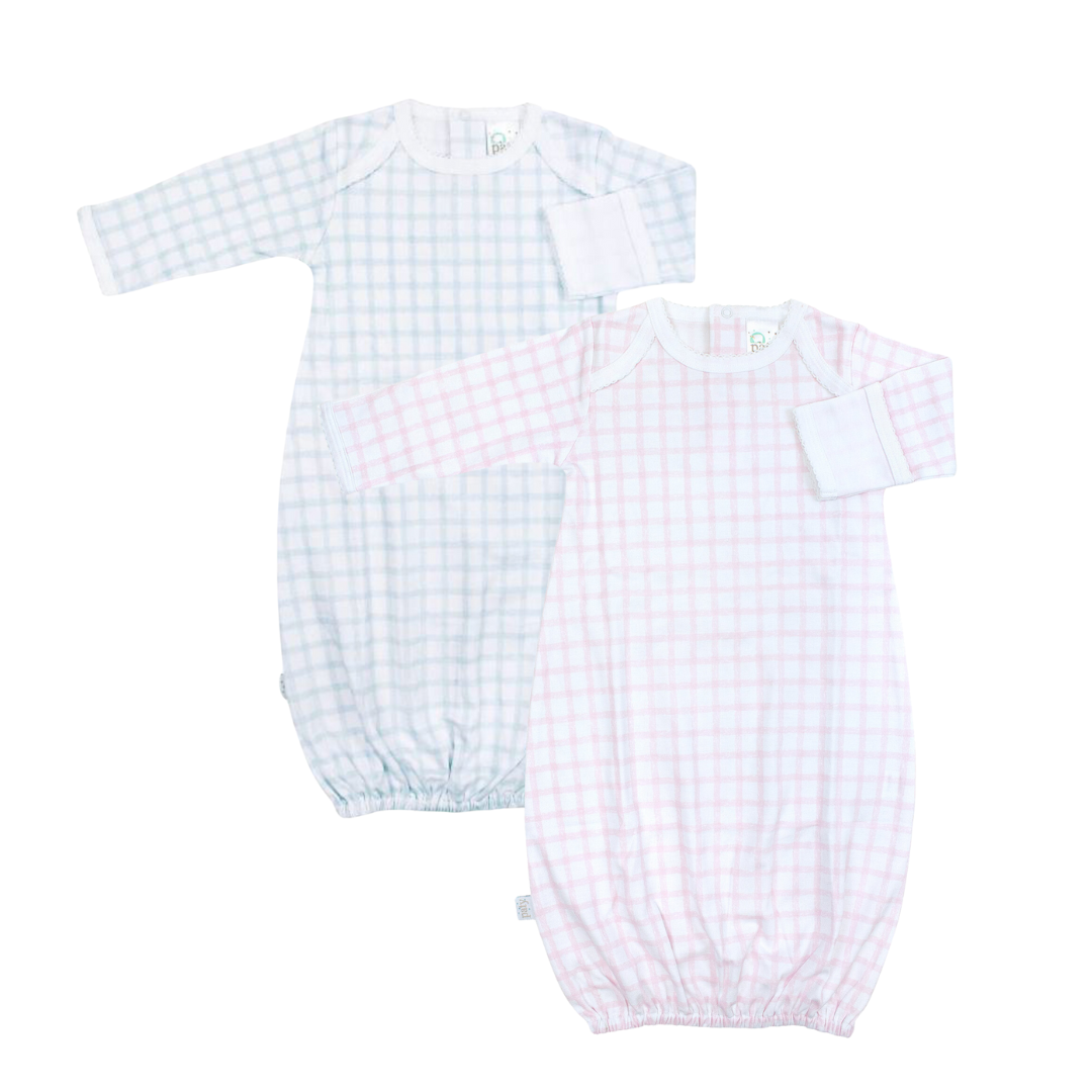 - The gown comes in blue gingham and pink gingham.