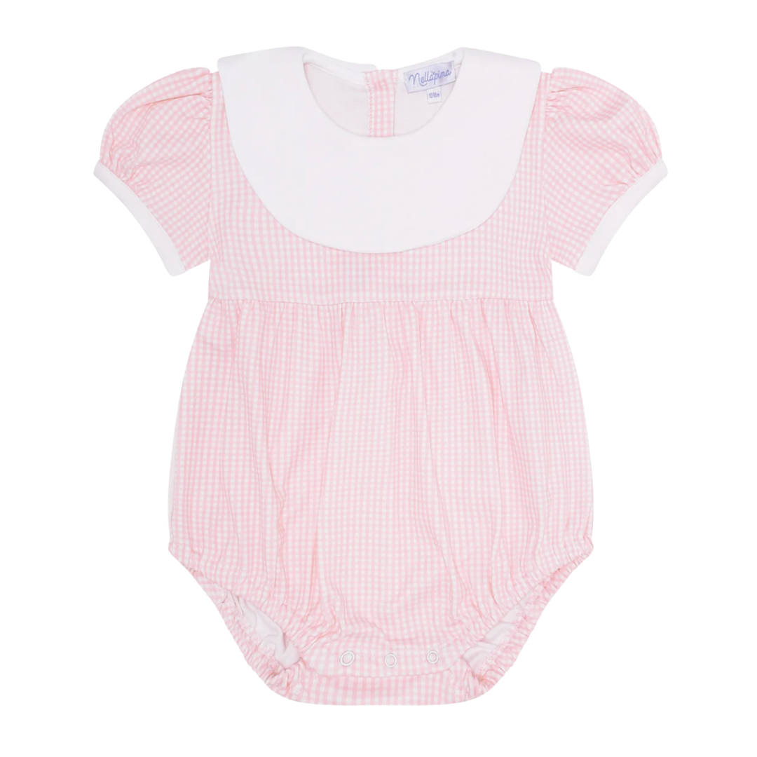 This pink gingham bubble is comfortable, cozy, and perfect for everyday wear. It has an elegant white collar and is a beautiful pastel pink. Please note that the collar is small and not all of our designs will fit on it.