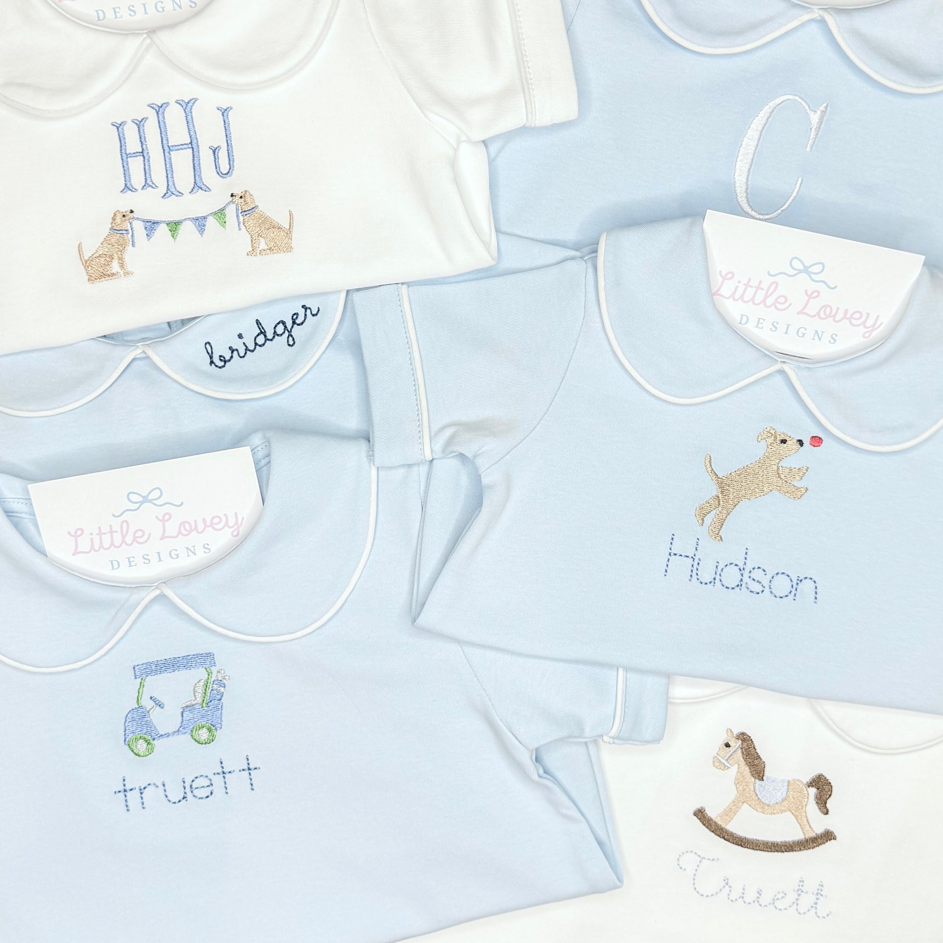 This piped collared bubble is so soft and perfect for a special occasion or even just play. It looks sweet with an embroidered name on the collar or in the center of the bubble.