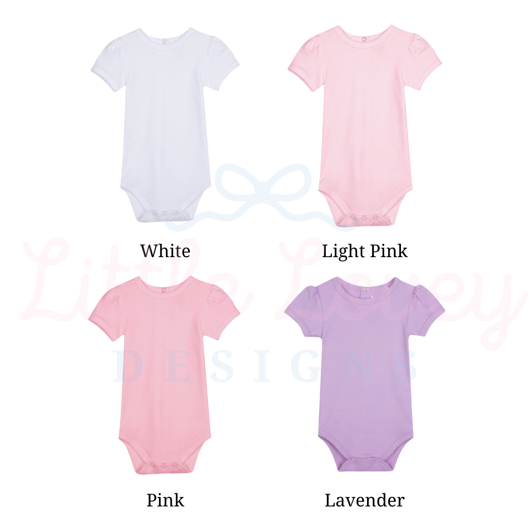 This onesie is precious and is perfect for year round. We love the puff sleeves and how sweet it looks with added personalization.