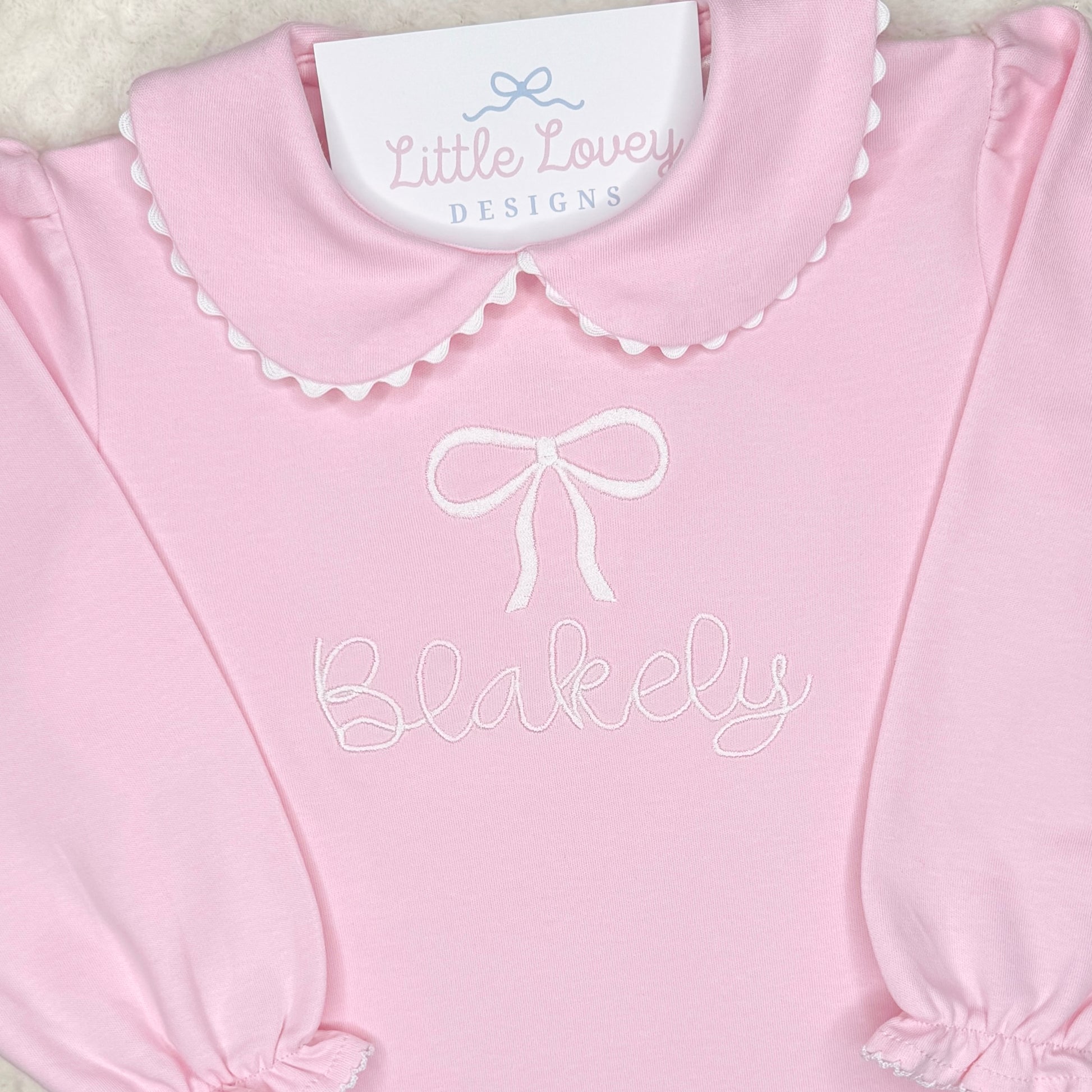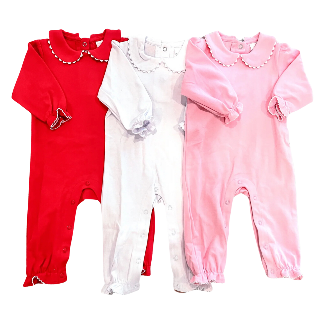 This scalloped collared romper is so soft and perfect for a special occasion or even just play. It looks sweet with an embroidered name on the collar or in the center of the romper.