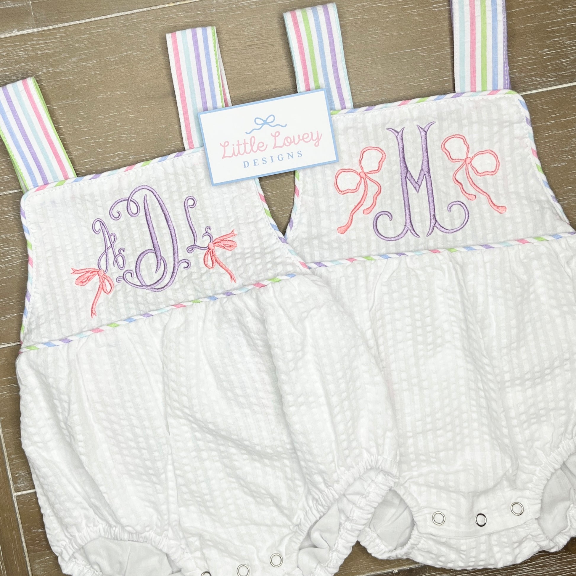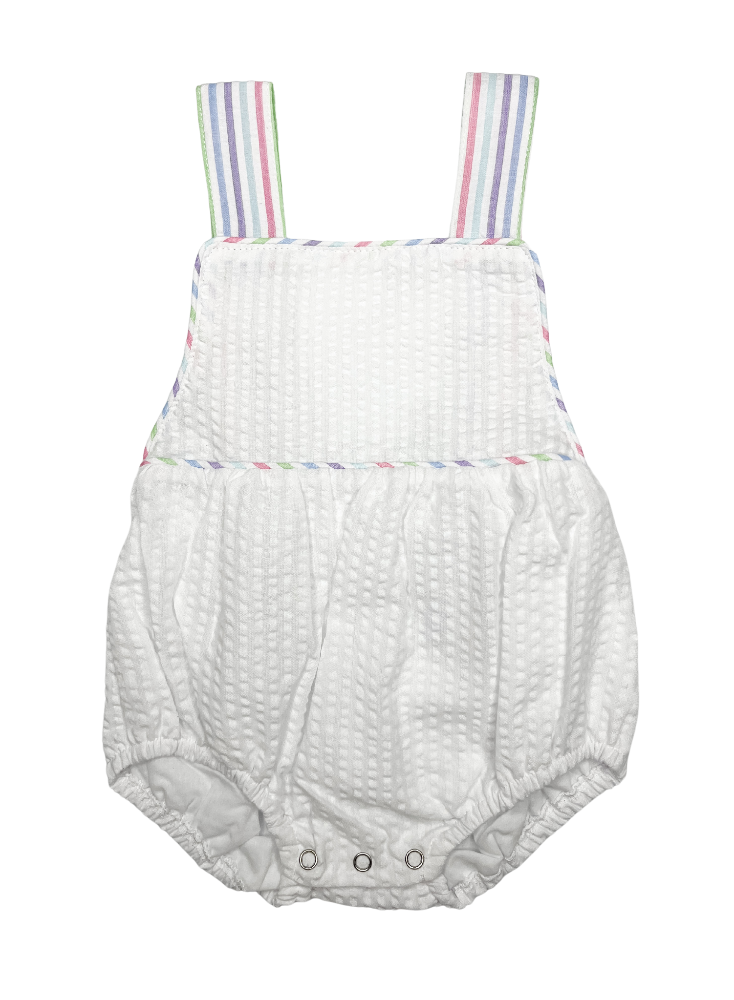 This seersucker sunbubble is perfect for spring and summer. The multicolor straps are fully adjustable and can be worn straight or crossed.