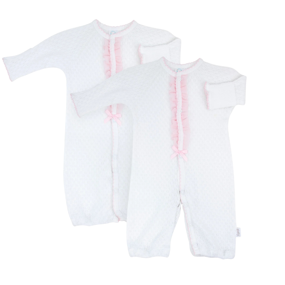This long sleeve converter is so precious! We love the chiffon trim detailing and how sweet it looks with added personalization. This is an outfit you will want to save and remember forever! It pairs perfectly with our white swaddle blanket and makes an excellent baby shower gift.
